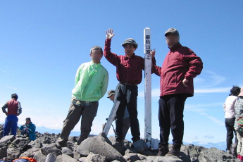 9:20 沢筋から山道に50m位入ったが、どうも道が分かりにくいので、引き返し沢筋を行く(15分ロスタイム) 9:55〜10:10 休憩(沢筋を出て眺望が開けたところ) 10:30 将軍平(2360m)ここから岩場のきつい登りが続く。 11:00 蓼科山頂(2530m)晴れ 山頂は半径100m位の広い所。 先月登った八ヶ岳が目の前にそびえ、御岳山、乗鞍岳、穂高岳、槍ケ岳、浅間山が眺望出来ました。 上空ではグライダーが気持ちよく飛行していました。 |