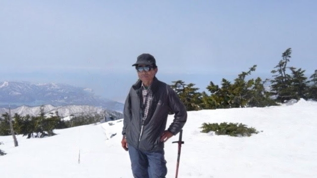 8:30着 北望台(第3リフト終点)(1820m) 漫画石塚真一さんの登山漫画、『岳』(小学館出版)で知識豊富な小学6年生親子らと一緒に、アイゼンを着け、衣服の調整する。遠くは鳥海山、月山、手前にはまだ雪に覆われた朝日連邦が見えている。 8:50 スタート。 |