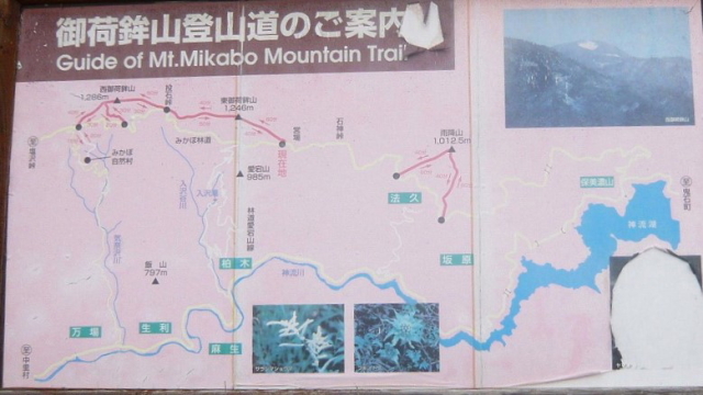 2009年5月11日 アクセス 新座料金所(関越道) → (8:25〜8:36)高坂SA → 9:01 本庄・児玉IC(左へ462号) → 9:12 橋を渡り100m進んで信号名の無い交差点を左折(R44) → 9:13金屋保育所前右折(R462) → 9:22 桜山公園(鬼石)(突き当たり左折) → R462は神流川に沿って走る → 諏訪を右折 → 左手は下久保ダム → 10:06 万場町(「みかぼ高原荘」と「本庄CC」の案内を見て右折して県道71 高崎神流秩父線) → (10:24〜10:33)みかぼ高原荘(トイレ借用) → 10:39 西御荷鉾山登山口前通過(左折) → 10:42着 オドケ山登山口 (注)R462下久保トンネルを過ぎて法久(ホック)を右折して御荷鉾スーパー林道に入ったほうが時間短縮になると思われる コースタイム (オドケ山登山) 10:50スタート オドケ山登山口 → 木段登りはじめて早々の分岐は右手を登る → (11:07〜11:12)オドケ山山頂(1191m) → 11:25着 オドケ山登山口(1065m) (西御荷鉾山登山口までバスで移動5分) 【所要時間 0時間35分】 【歩行時間 0時間30分】 (西御荷鉾山と東御荷鉾山) 11:32発 西御荷鉾山登山口(1060m) → 11:35 右へ大きく曲がる(すぐ上に標識有り) → (11:54〜11:57)尾根に出て休憩 → 12:04 分岐直進(右に下る道があるので注意) → (12:06〜12:32)西御荷鉾山山頂(1286m)(昼食)下山は山頂東側から → 12:53 投石峠(1015m)(スーパー林道を東へ1分ほど歩く) → (12:54〜13:00)東御荷鉾山登山口(1030m)(休憩) → (13:47〜14:00)東御荷鉾山山頂(1246m)(下山は山頂北側の石仏の裏から) → 14:08 右へ(直進する道があるが行き止まり) → 14:27 右手の石神峠方面へ(しばらく進むと右手に林道が見え隠れする) → 14:32 左へ降りてコンクリート道へ出る) → 14:34着 登山口(900m) 【所要時間 3時間02分】 【歩行時間 2時間14分】 帰路 14:37発 登山口(バス移動) → 14:50 西御荷鉾山登山口の分岐通過(左へ) → (14:55〜16:00)みかぼ高原荘(入浴) → 14:03 西御荷鉾山登山口の分岐を左へ(帰路は秩父経由に) → 16:11 塩沢峠左折 → 17:08 皆野・寄居有料道路 → 17:42 花園IC → (17:59〜18:15)高坂SA 山行記録 5月11 日(晴れ)(オドケ山登山) 10:50スタート オドケ山登山口 → 木段登りはじめて早々の分岐は右手を登る 11:07〜11:12 オドケ山山頂(1191m) 周回の登山道もあったが現在は荒れていたのでピストンで下山した。 11:25着 オドケ山登山口(1065m) バスで西御荷鉾山登山口まで移動する |