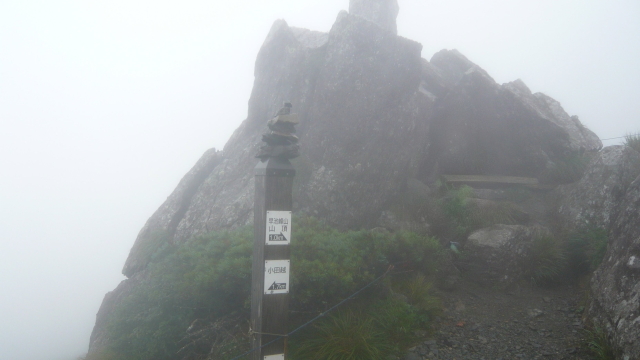 9:04〜9:40 早池峰山山頂(1917m) 山頂直前のクサリ場は雨の為、クサリ、岩共に滑りやすく、慎重に登りました。山頂に着いても雨が降り続いていて視界は全くありません。山頂は岩だらけですが広く、整備された避難小屋もありました。記念写真だけ撮ってすぐに避難小屋に入ると、先行の方一名と林野庁・森林管理署の方がつめられていました。