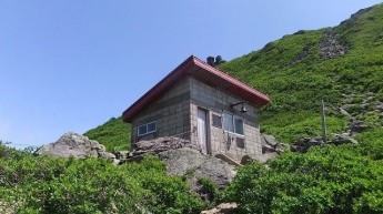 9:43 鳳鳴ヒュッテの右手に一番の難所「二のおみ坂」が見えてます。おみ坂とは神様の御前の坂の意 |