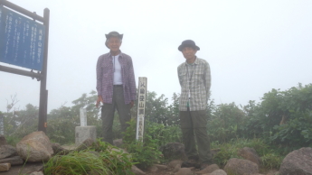 | 9:28~10:00 浅草岳(1586m) 霧が深くて展望は全く開け無かったので、各自簡単な昼食をとり、早めに下山しました。 |