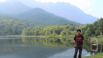 | 15:50 鏡池 幸運なことに朝から立ち込めていた厚い雲は、私たちの来訪に合わせて徐々に消えていき、池に映る勇壮な戸隠山を仰ぎ見ることが出来ました。 |
